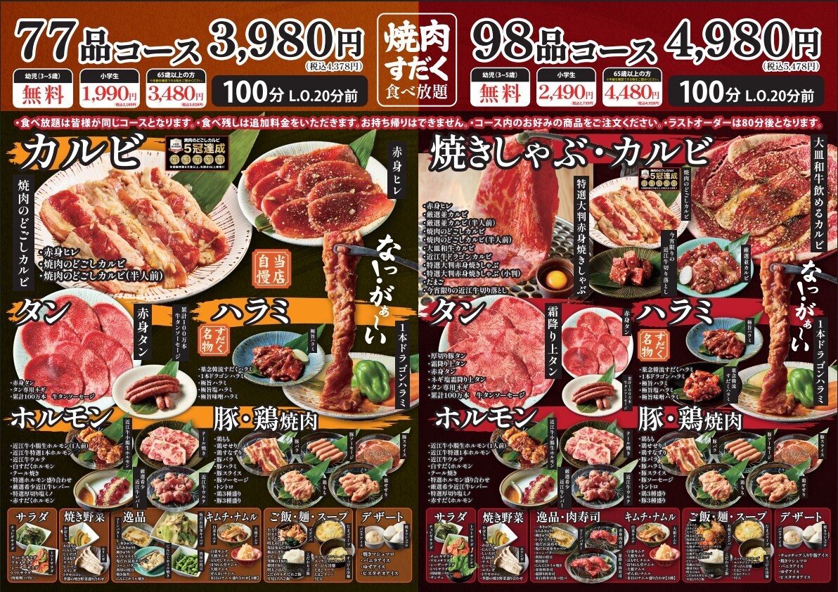 近江牛を含む平日限定の食べ放題からグランドメニューまでお選び頂けます。