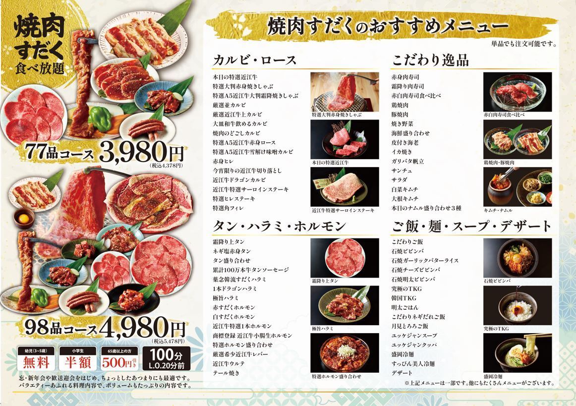 近江牛を含むお肉や近江米、また食べ放題や飲み放題、サイドメニューをお楽しみください。